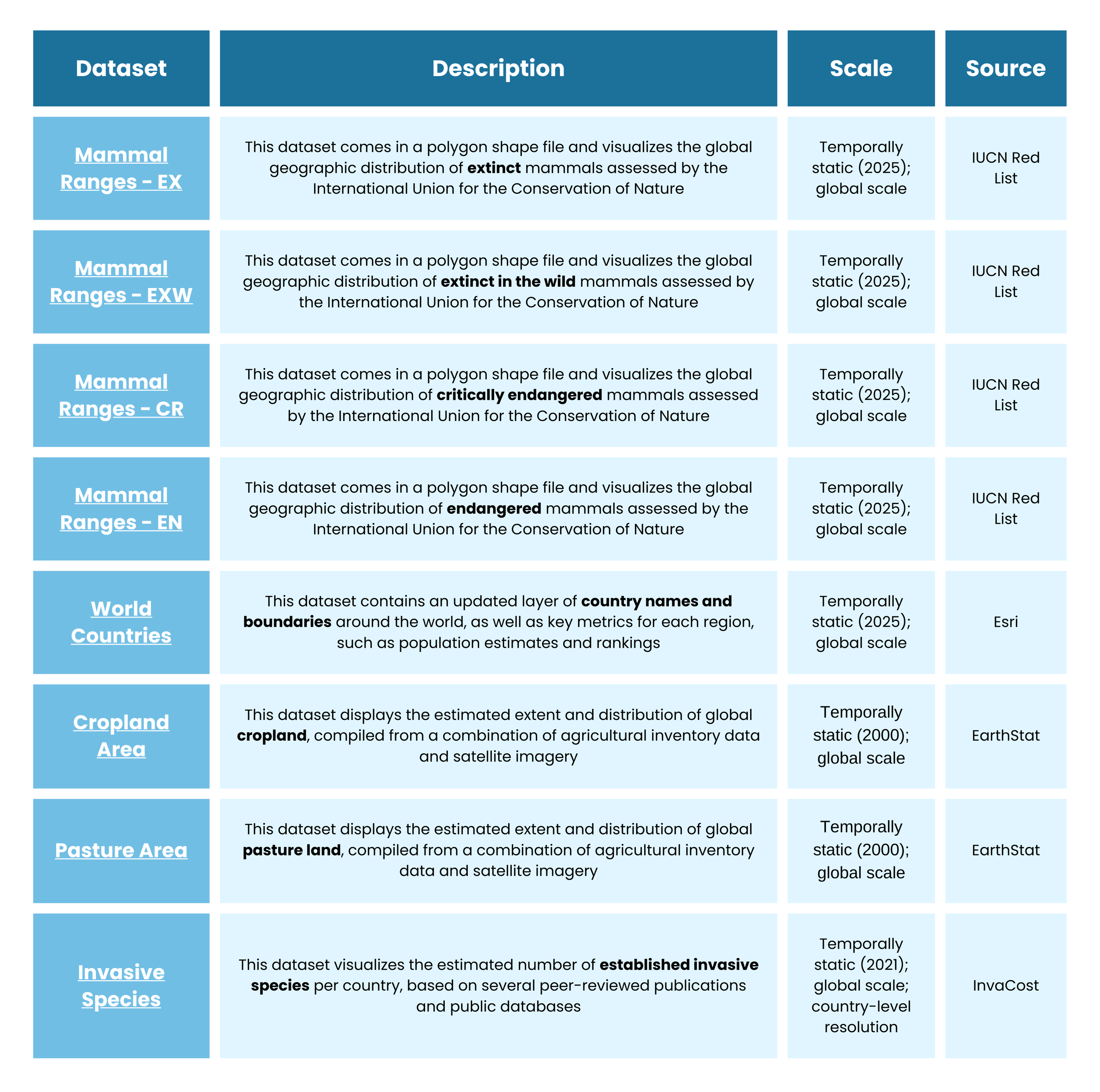 The table below describes each of the data sources used in this project, including both the validation data (IUCN threatened mammal ranges) and the anthropogenic variables that served as inputs for my final models.