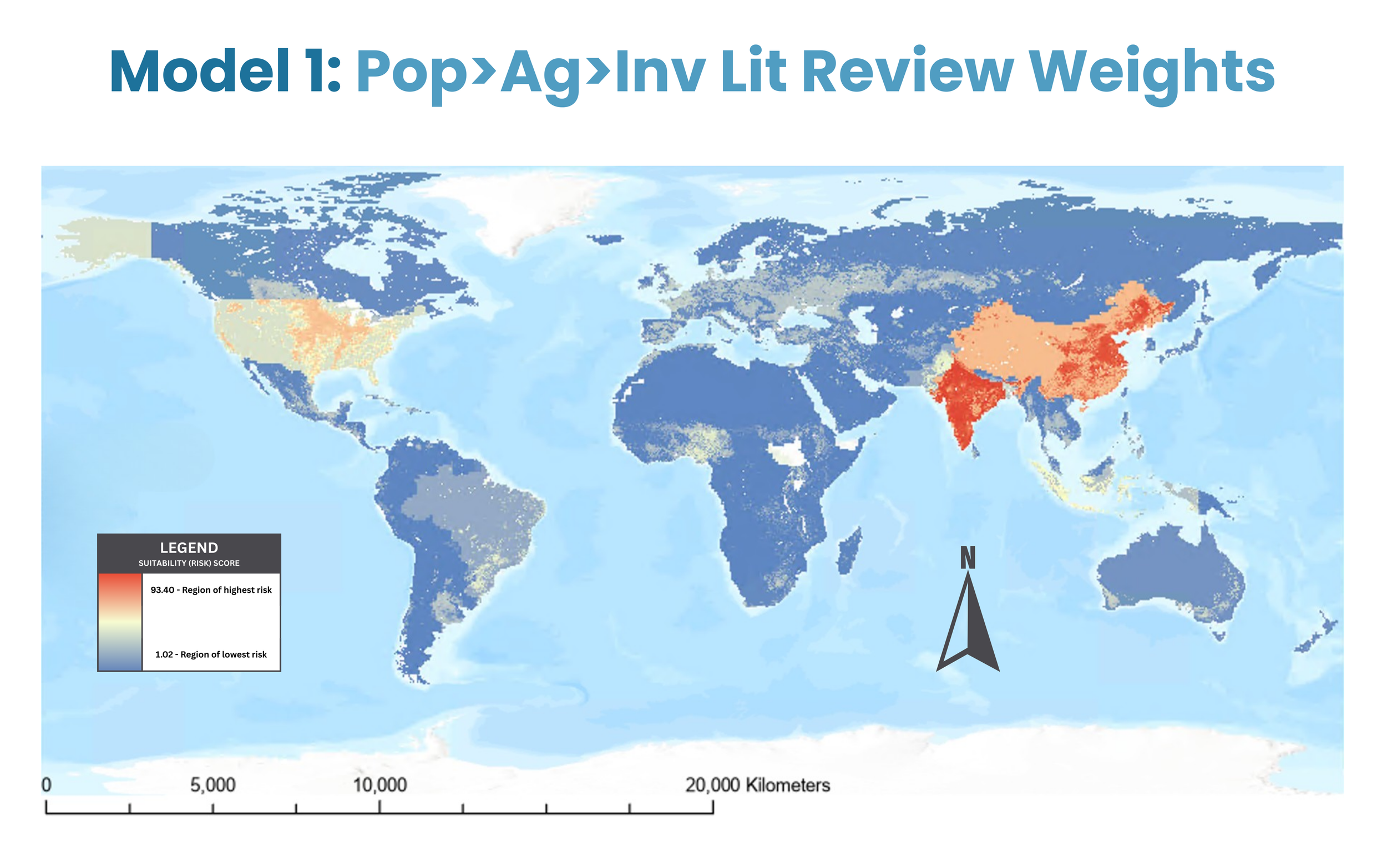 In Model 1 (population weight = 64.84, agricultural conversion weight = 28.42, invasive species weight = 6.75; all MSLarge membership models), the highest risk areas occur in South and East Asia, with particular emphases on India and Eastern China (risk factor ~ 93.04).