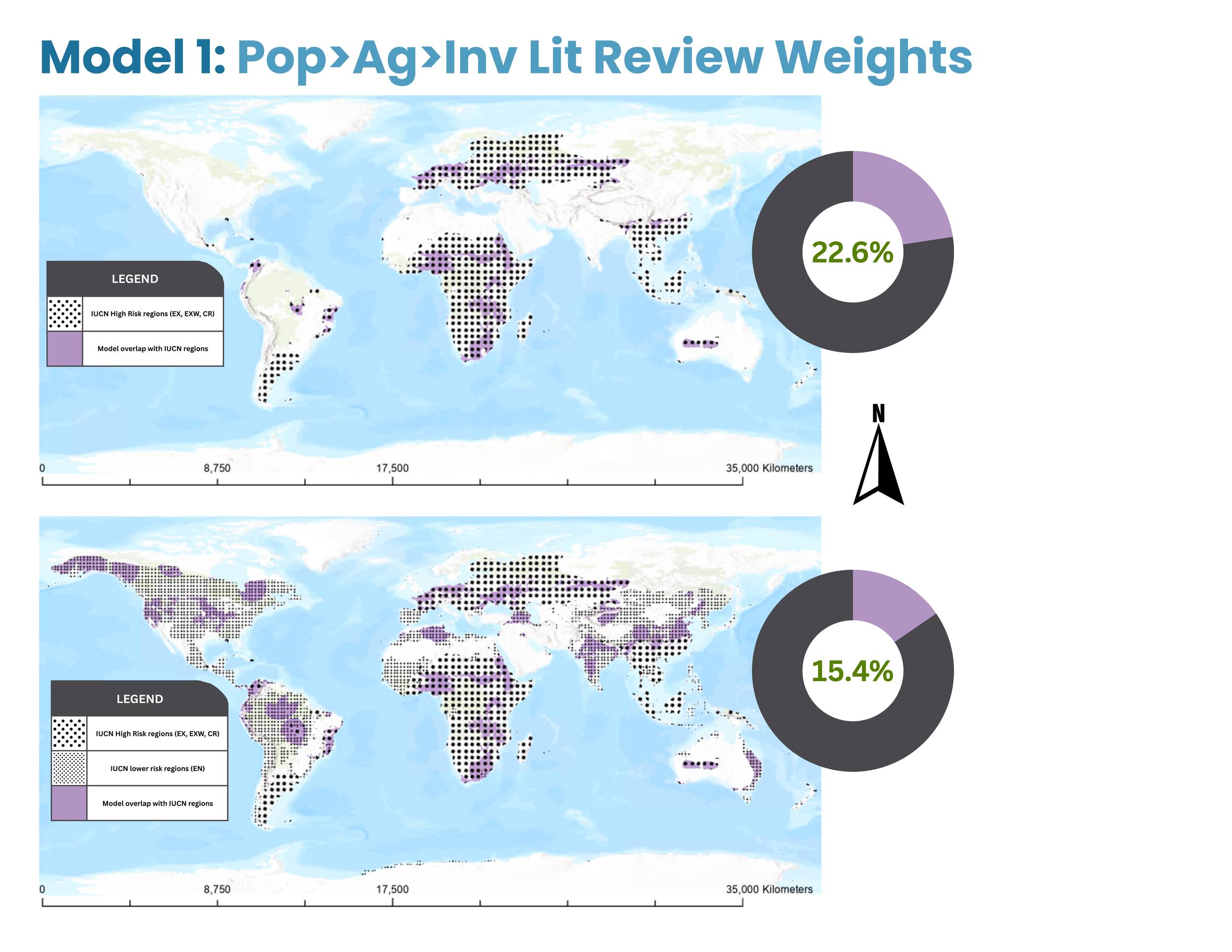 In Model 1, the highest predicted risk regions (constrained to the ranges defined by the IUCN data) covered 22.6% of the total high risk (EX, EXW, CR) validation area, out of 62% total possible overlap given the total area of the model’s output compared to the total area of the high risk IUCN ranges. However, the model’s predicted risk regions only accounted for 15.4% of the broader validation risk areas (EX, EXW, CR, and EN).