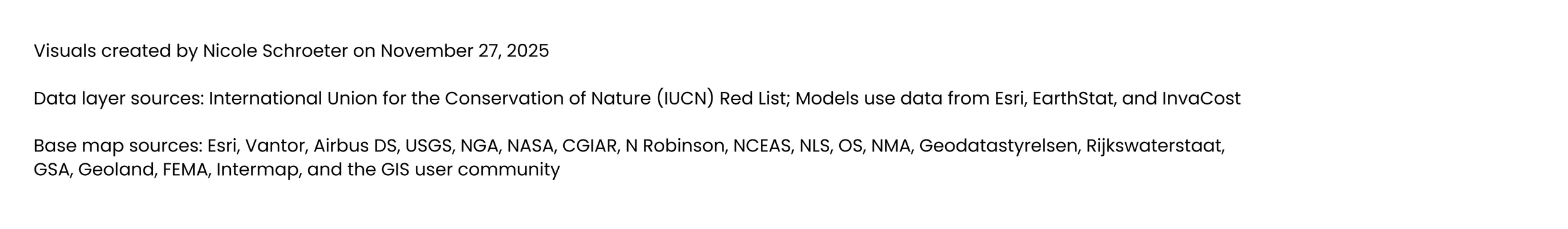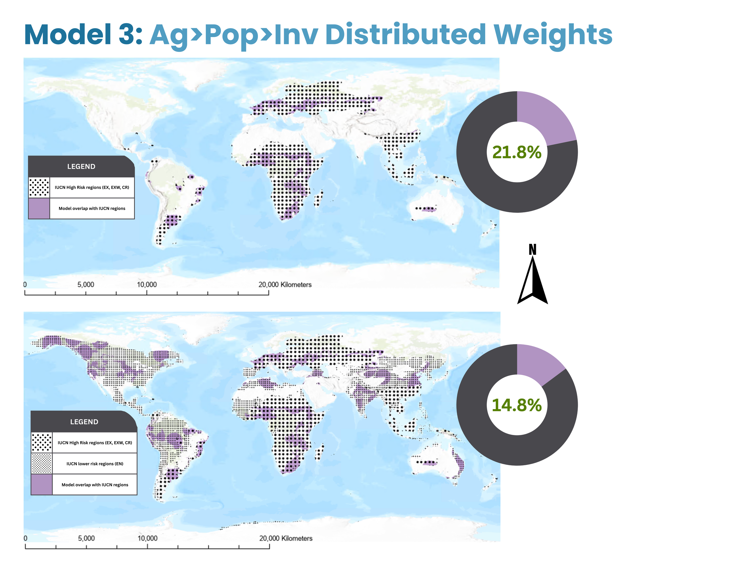 In Model 3, the highest predicted risk regions (constrained to the ranges defined by the IUCN data) covered 21.8% of the total high risk (EX, EXW, CR) validation area, out of 62% total possible overlap given the total area of the model’s output compared to the total area of the high risk IUCN ranges. However, the model’s predicted risk regions only accounted for 14.8% of the broader validation risk areas (EX, EXW, CR, and EN).