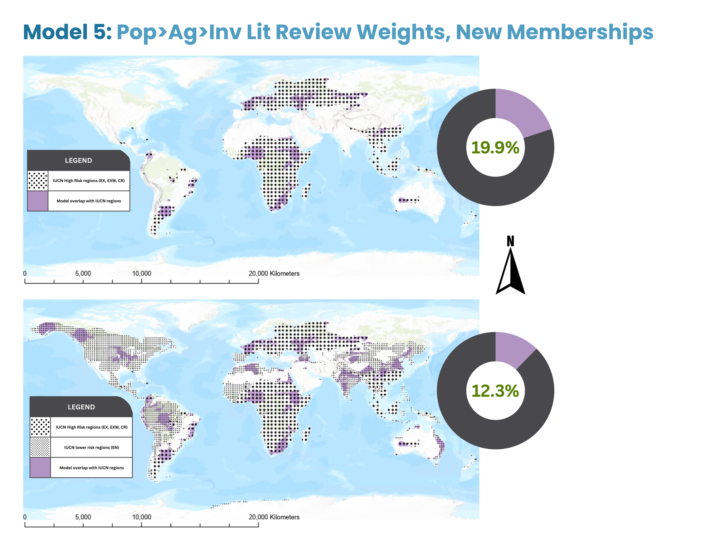 In Model 5, the highest predicted risk regions (constrained to the ranges defined by the IUCN data) covered 19.9% of the total high risk (EX, EXW, CR) validation area, out of 62% total possible overlap given the total area of the model’s output compared to the total area of the high risk IUCN ranges. However, the model’s predicted risk regions only accounted for 12.3% of the broader validation risk areas (EX, EXW, CR, and EN).