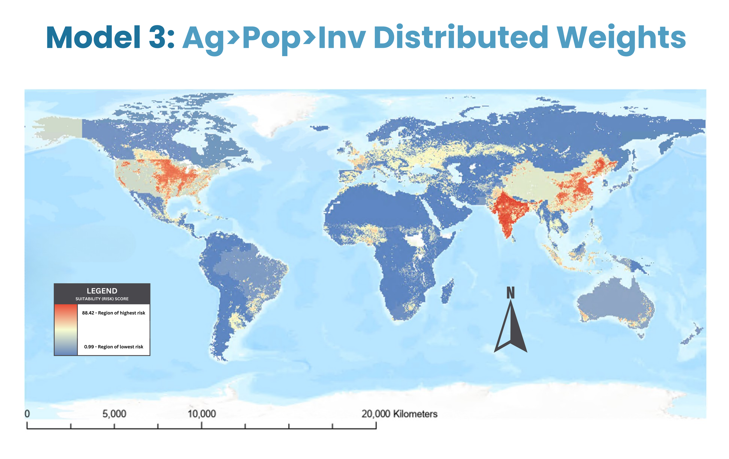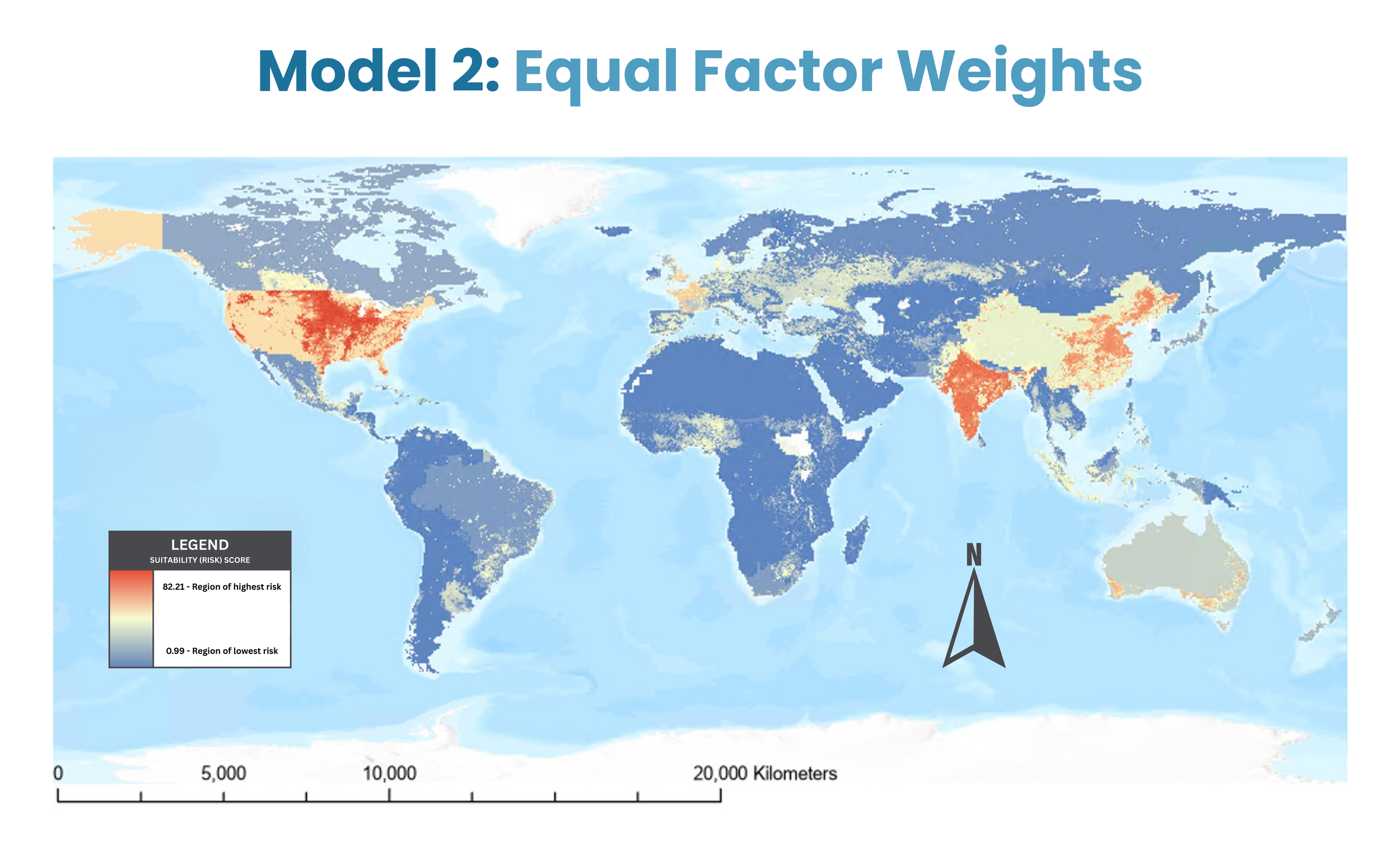 In Model 2 (population weight = 33.33, agricultural conversion weight = 33.33, invasive species weight = 33.33; all MSLarge membership models), the highest risk areas occur in central United States and India (risk factor ~ 82.21).