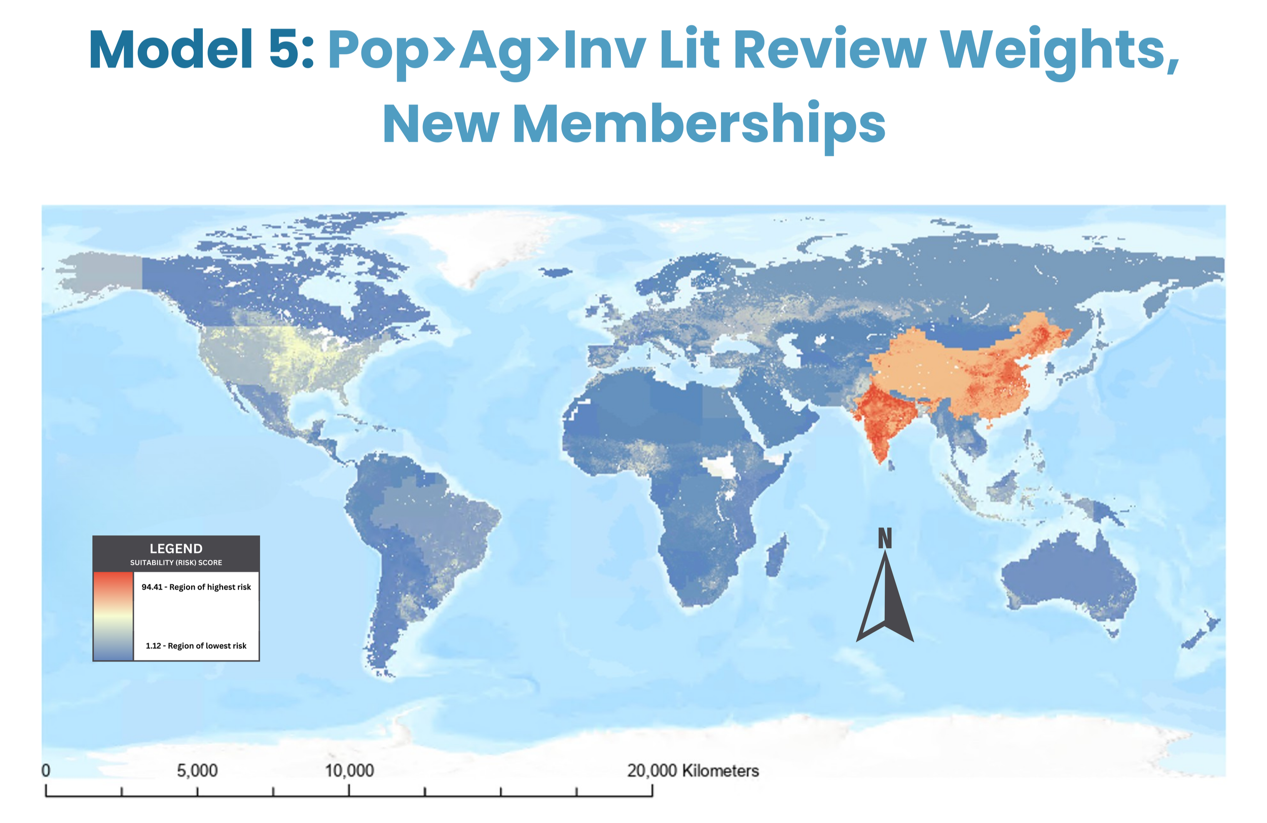 In Model 5 (population weight = 64.84, agricultural conversion weight = 28.42, invasive species weight = 6.75; all Linear membership models), the highest risk areas occur in India and China (risk factor ~ 94.41).