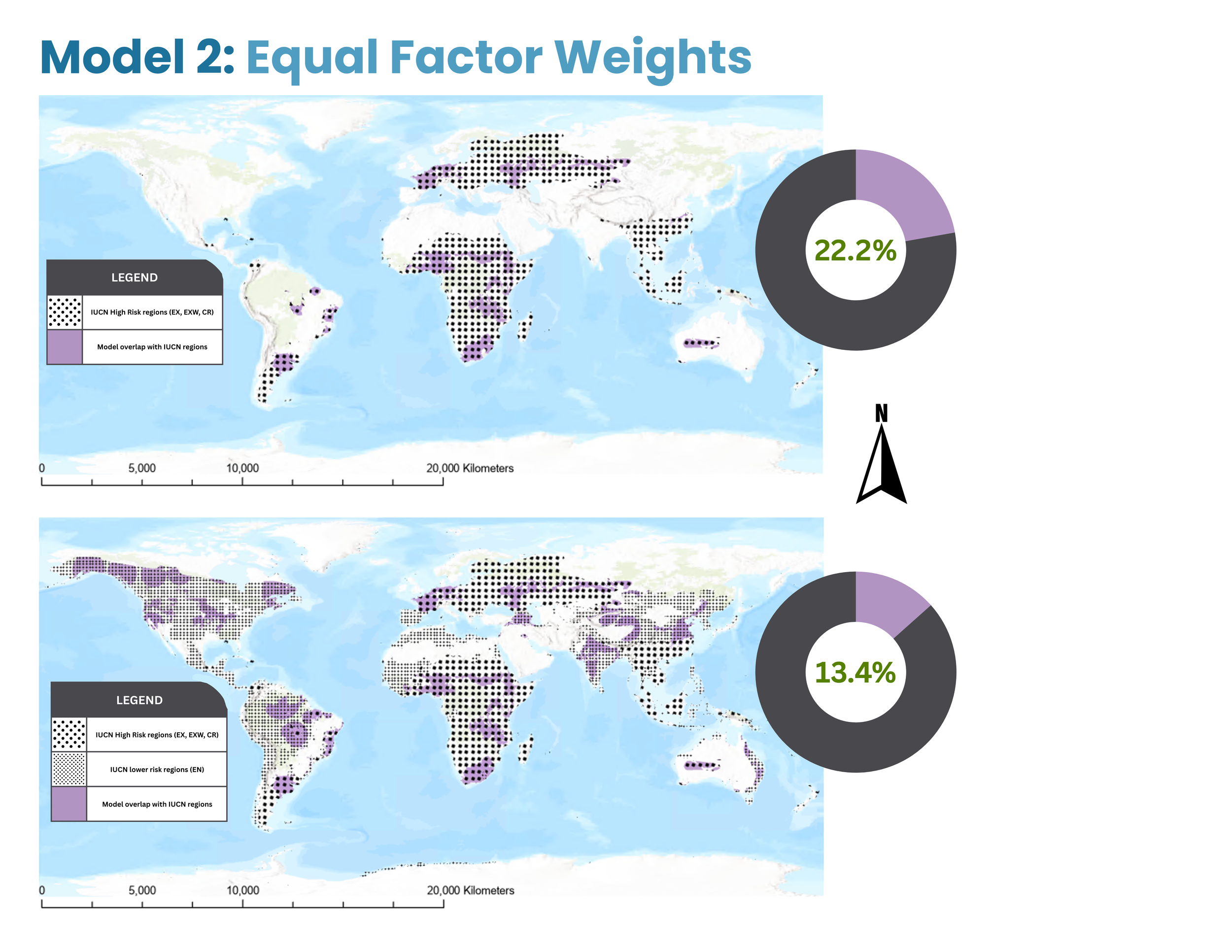 In Model 2, the highest predicted risk regions (constrained to the ranges defined by the IUCN data) covered 22.2% of the total high risk (EX, EXW, CR) validation area, out of 62% total possible overlap given the total area of the model’s output compared to the total area of the high risk IUCN ranges. However, the model’s predicted risk regions only accounted for 13.4% of the broader validation risk areas (EX, EXW, CR, and EN).